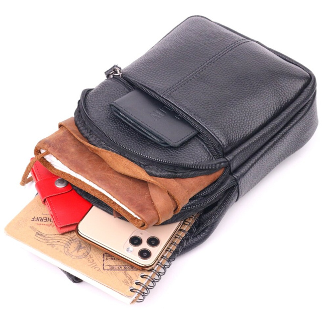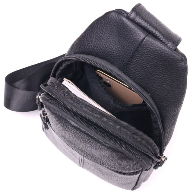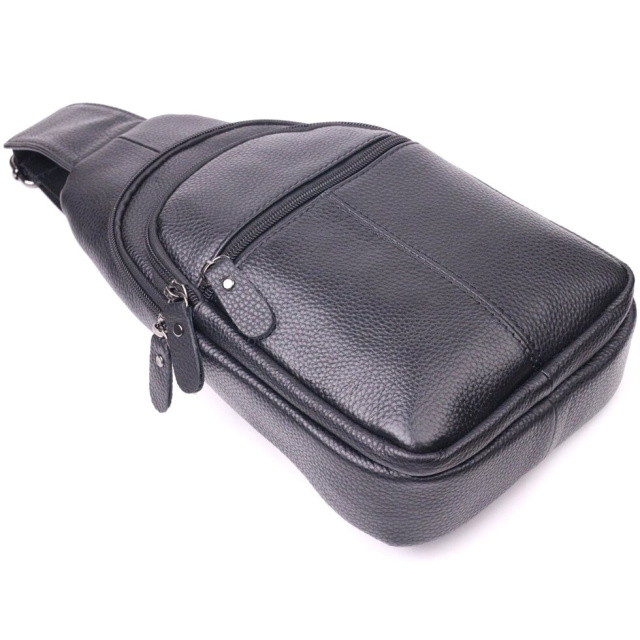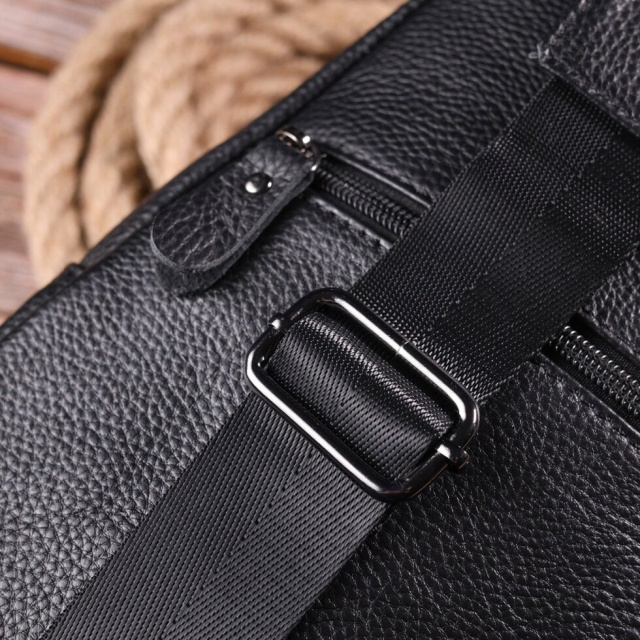 Практична чоловіча сумка слінг через плече з натуральної високоякісної шкіри з відмінними характеристиками якості та зносостійкості. Аксесуар має досить містке основне відділення та додаткові кишені на зовнішній та тильній стороні для речей, які мають бути швидко доступні. Лицьова сторона, сумки декорована рівним світлим рядком, що надає виробу цікавого стильного вигляду. Ремінь можна регулювати по довжині, виконаний з високоміцного текстилю. Шкіряна сумка, завжди була чудовим подарунком для рідних та близьких людей.