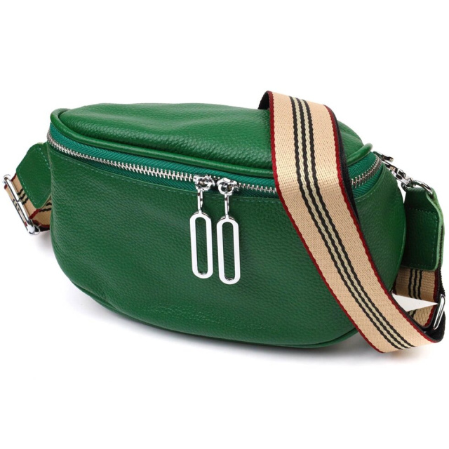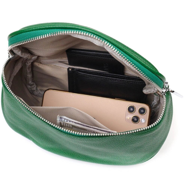 Жіноча сумочка в соковитому зеленому кольорі з натуральної шкіри високої якості. Виріб дуже зручний, можна носити на плечі та через плече, відмінний повсякденний варіант невеликої сумки. Модель доповнена фурнітурою сріблястого кольору. Аксесуар має одне основне відділення в якому дві кишеньки - на блискавці та відкритого типу. Модний та практичний варіант сумки для стильних жінок.
