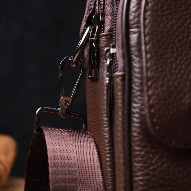 Функціональна сумка із натуральної шкіри. Аксесуар складається з основного відділення на блискавці, потайної кишені всередині, накладної кишені на блискавці, на лицьовій стороні, вбудованої кишені під клапаном, на магнітах, на лицьовій стороні та двох горизонтальних кишень на блискавках ззаду. Носити сумку можна на плечі, через плече, а також у руках за ручку. Ідеальний варіант як для ділового, так і для міського стилю.