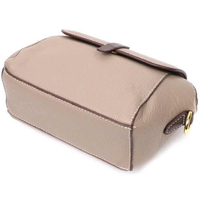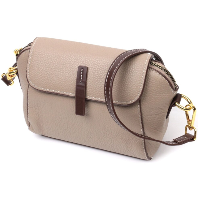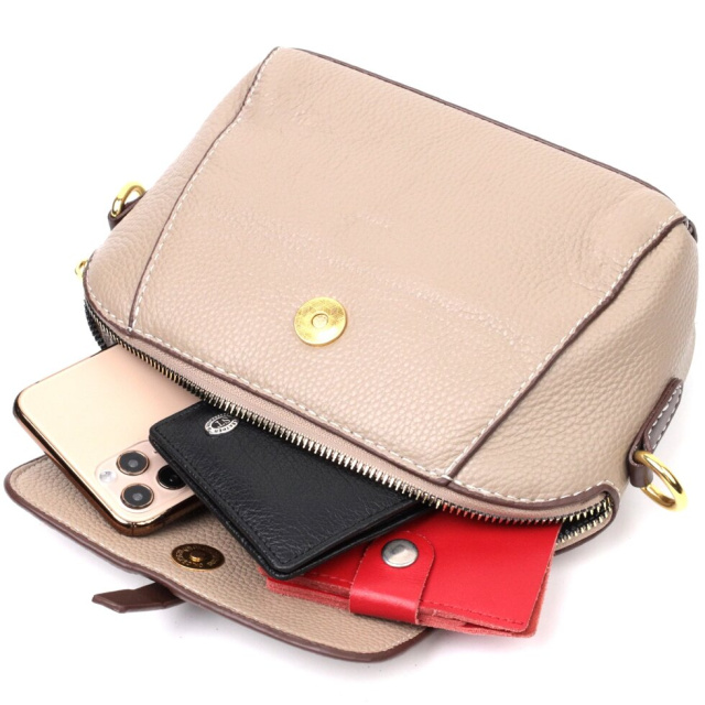Якісна жіноча сумка із ущільненим дном. Виріб пошитий з якісної натуральної шкіри, яка довго носиться і не втрачає свого первісного вигляду. Аксесуар складається з одного основного відділення, всередині якого кишеня-перегородка на блискавці, кишеня відкритого типу, потайна кишеня на блискавці та ще одна кишеня на блискавці зовні. Носити сумку можна в руці, на плечі і через плече, для цього є шкіряний ремінь, що знімається. У виробі використано якісну фурнітуру кольору жовтого золота. Універсальний варіант сумки як на вечір так і як сумочка на кожен день.