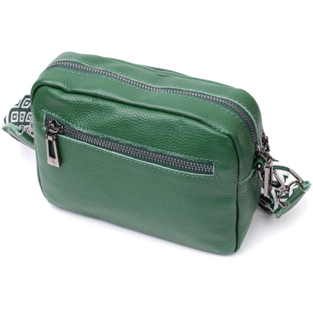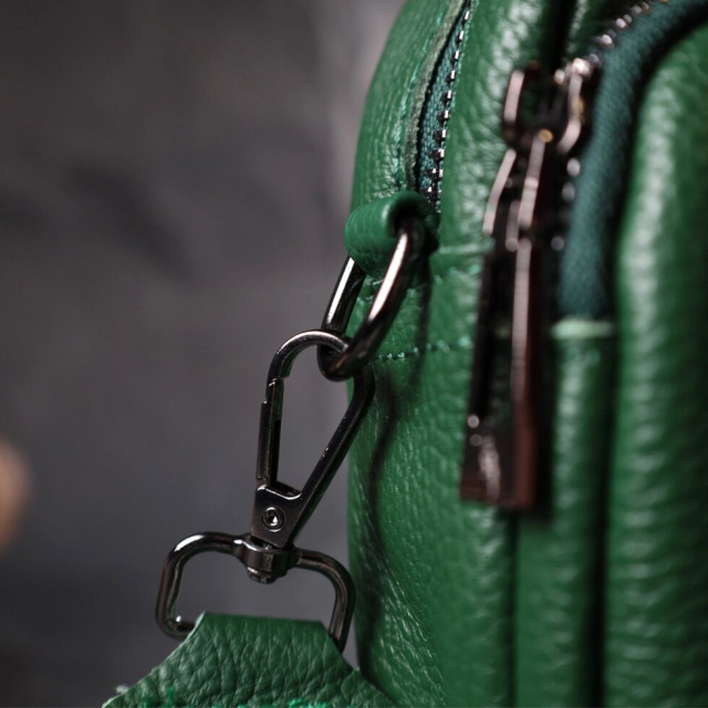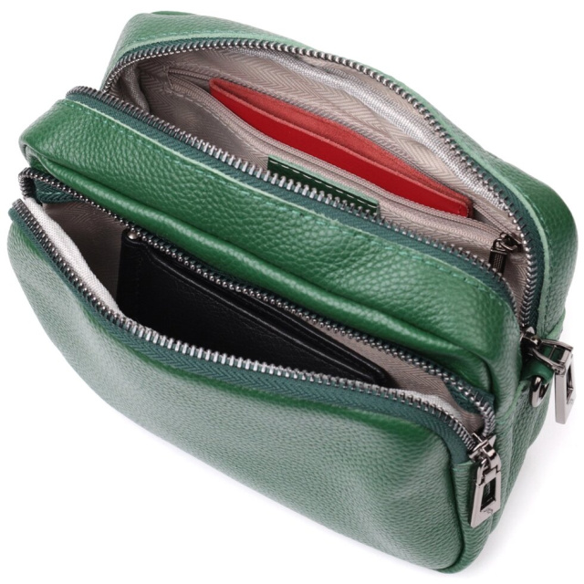 Компактна жіноча сумка з накладною кишенею на лицьовій стороні. Виріб пошитий з якісної натуральної шкіри, яка довго носиться і не втрачає свого первісного вигляду. Аксесуар складається з одного основного відділення всередині якого розташована кишеня відкритого типу і кишеня на блискавці, також зовні розташована кишеня на блискавці, на тильній стороні та накладна кишеня на блискавці, на лицьовій стороні. Носити сумку можна в руці як клатч, на плечі та через плече, для цього є текстильний ремінь, що знімається. У виробі використано якісну фурнітуру кольору темного срібла. Універсальний варіант сумки як на вечір так і як сумочка на кожен день.