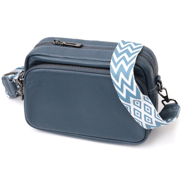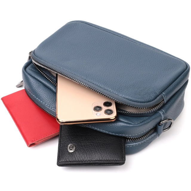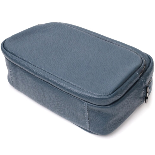 Невелика жіноча сумка з накладною кишенею на лицьовій стороні. Виріб пошитий з якісної натуральної шкіри, яка довго носиться і не втрачає свого первісного вигляду. Аксесуар складається з одного основного відділення всередині якого розташована кишеня відкритого типу і кишеня на блискавці, також зовні розташована кишеня на блискавці, на тильній стороні та накладна кишеня на блискавці, на лицьовій стороні. Носити сумку можна в руці як клатч, на плечі та через плече, для цього є текстильний ремінь, що знімається. У виробі використано якісну фурнітуру кольору темного срібла. Універсальний варіант сумки як на вечір так і як сумочка на кожен день.