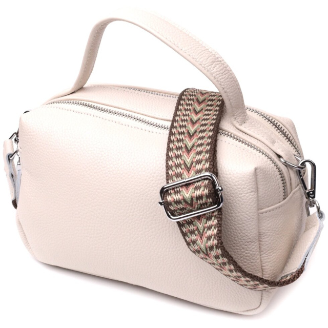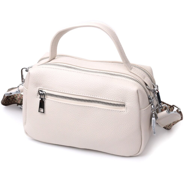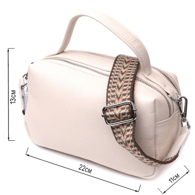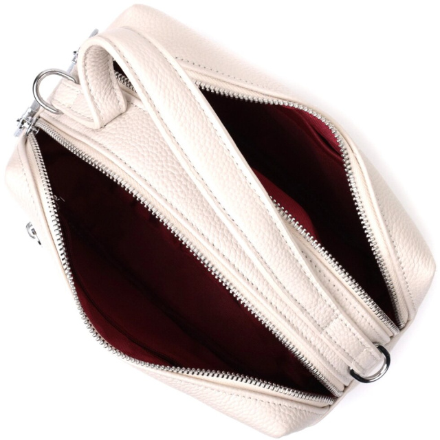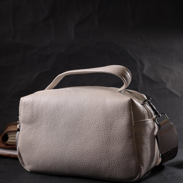 Оригінальна жіноча сумка на два автономні відділення з натуральної шкіри флотар, яка невибаглива у догляді та довго носиться. Аксесуар складається з двох основних відділень, потайної кишені на блискавці, кишені відкритого типу та кишені на блискавці зовні. Носити сумку можна в руках, на плечі і через плече, для цього є шкіряна ручка і знімний текстильний ремінь. У виробі використано якісну фурнітуру кольору срібла. Універсальний варіант сумки як на вечір так і як сумочка на кожен день.