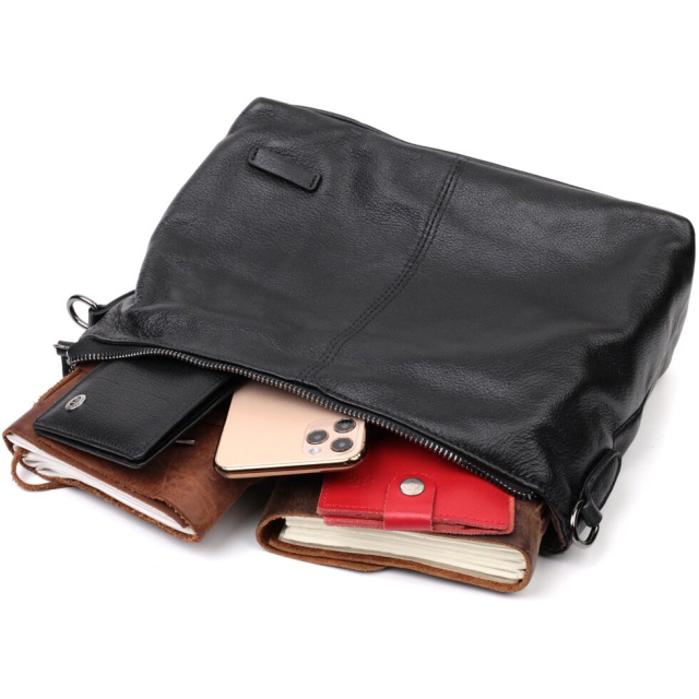 Модна та зручна жіноча сумка на кожен день з м'якої натуральної шкіри, яка чудово носиться та не втрачає свого первісного вигляду. Аксесуар складається з одного основного відділення, потайної кишені на блискавці та кишені відкритого типу. Носити сумку можна в руках, на плечі і через плече, для цього є шкіряний і текстильний ремінці, що знімаються. У виробі використано якісну фурнітуру кольору темного срібла. Відмінний варіант як сумочка на кожен день.