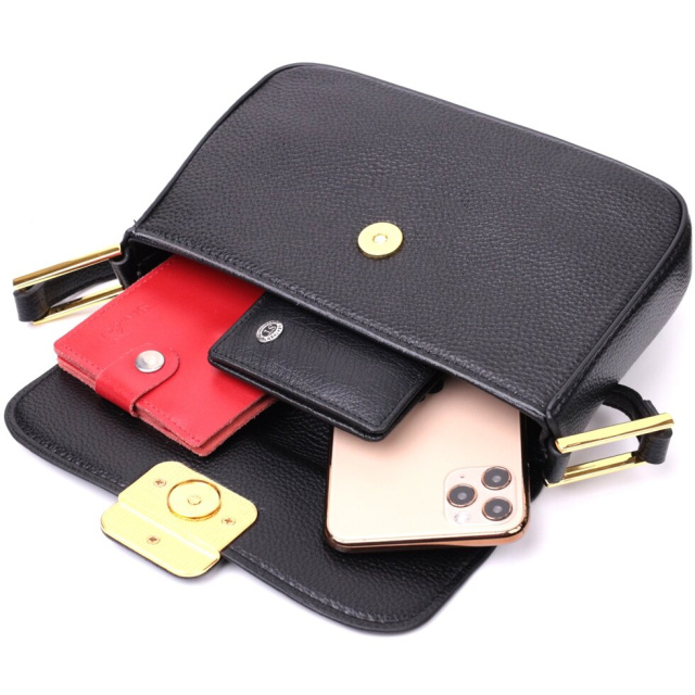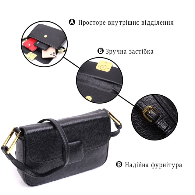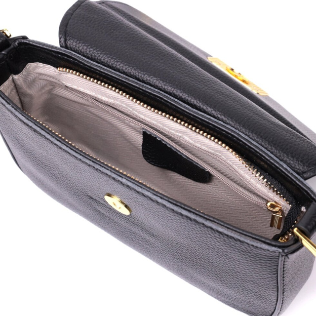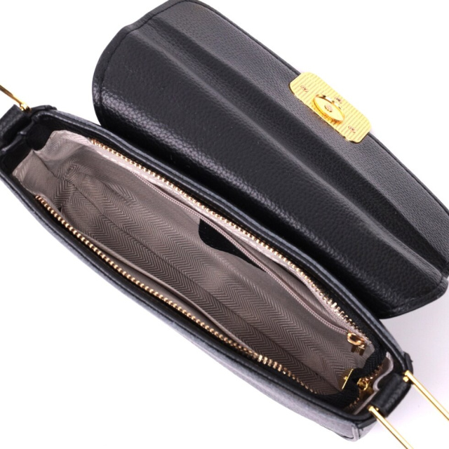 Оригінальна сумка з твердим каркасом із натуральної шкіри з високим показником якості та зносостійкості. Аксесуар складається з основного відділення, що закривається на блискавку та клапаном на магніт, усередині якого знаходиться потайна кишеня на блискавці та кишеня відкритого типу. Носити сумку можна на плечі, через плече для цього є незнімний шкіряний ремінь, що регулюється, а також як клатч під рукою. У виробі використано якісну фурнітуру кольору жовтого золота.