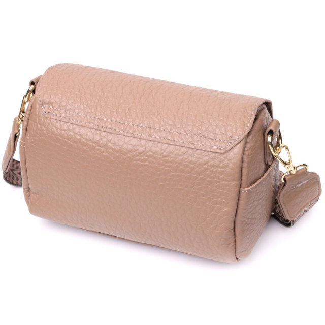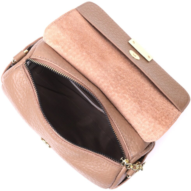 Невелика жіноча сумка з якісної натуральної м'якої шкіри, яка довго носиться і не втрачає свій первісний вигляд. Аксесуар складається з основного відділення, потайної кишені на блискавці, кишені відкритого типу, а також двох невеликих бічних кишень зовні. Носити сумку можна під рукою, на плечі і через плече, для цього є текстильний ремінь, що знімається. У виробі використано якісну фурнітуру кольору жовтого золота. Чудовий варіант сумки на кожен день.