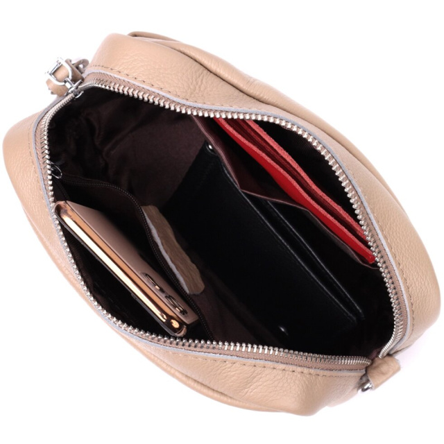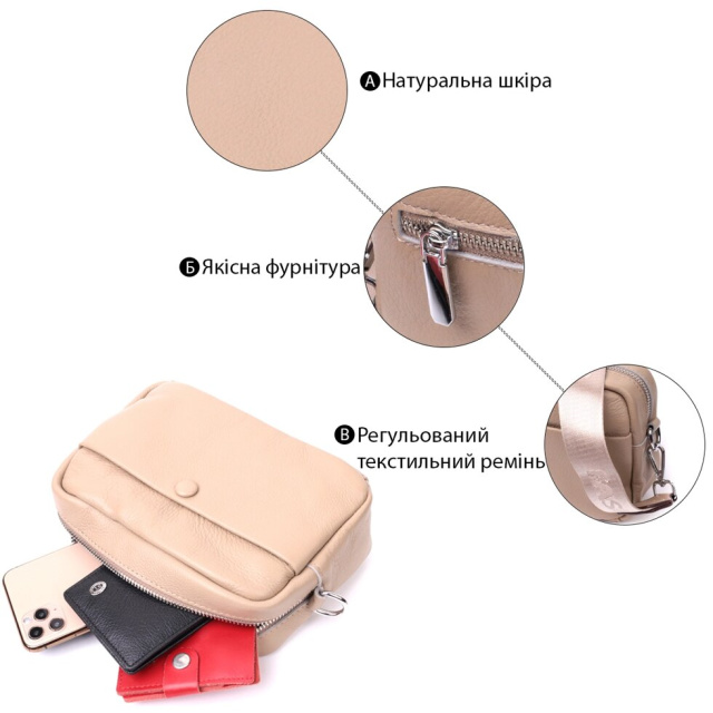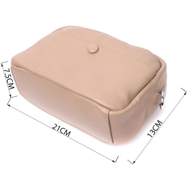 Жіноча прямокутна сумка з натуральної шкіри з високим показником якості та зносостійкості. Аксесуар складається з основного відділення, що закривається на блискавку, всередині якого знаходиться потайна кишеня на блискавці та кишеня відкритого типу, а також кишеня на блискавці на тильній стороні зовні та кишеня на магніті на лицьовій стороні. Носити сумку можна на плечі, через плече для цього є знімний регульований текстильний ремінь, а також як клатч під рукою. У виробі використано якісну фурнітуру срібного кольору.