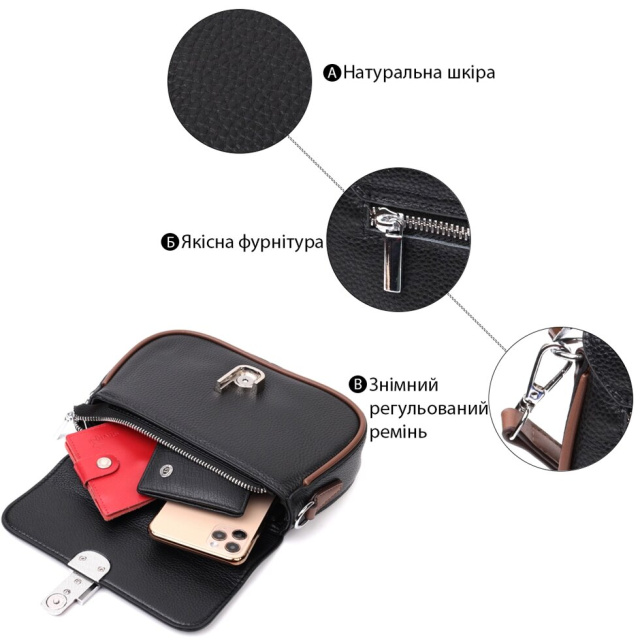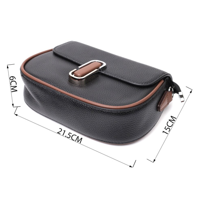 Класична жіноча сумка з якісної натуральної шкіри, яка довго носиться і не втрачає свого первісного вигляду. Аксесуар складається з одного основного відділення всередині якого потайна кишеня на блискавці, кишеня відкритого типу та кишеня-перегородка, а зовні, на тильній стороні розташована кишеня на блискавці. Носити сумку можна в руці, на плечі і через плече, для цього є шкіряний ремінь, що знімається. У виробі використано якісну фурнітуру срібного кольору. Універсальний варіант сумки як на вечір так і як сумочка на кожен день.