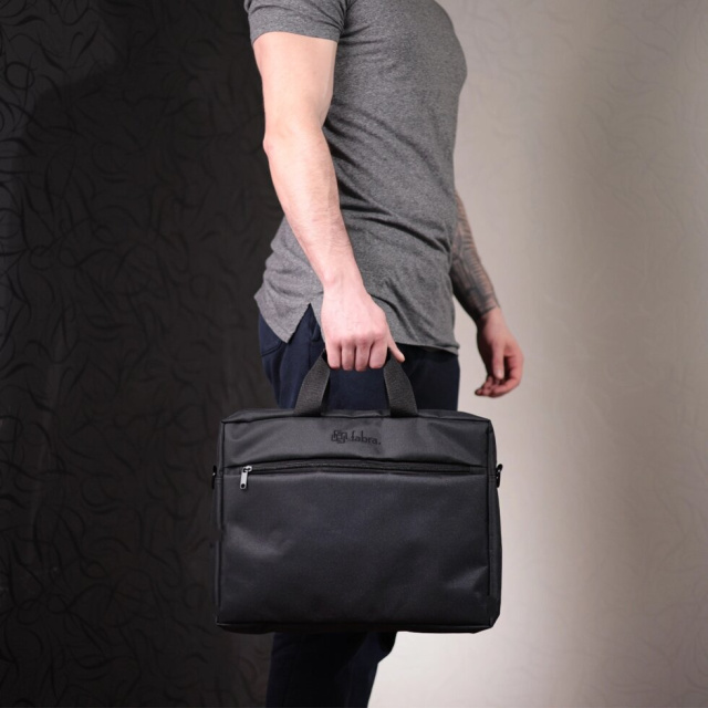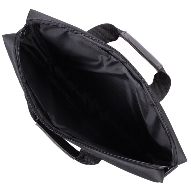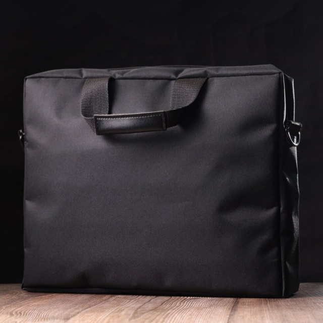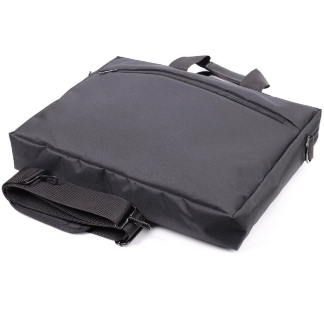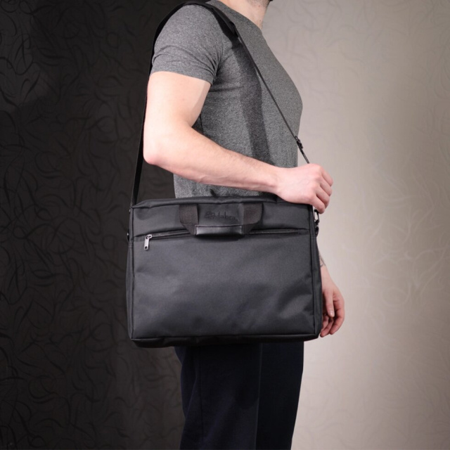 Горизонтальна ділова сумка на кожен день із якісного матеріалу – поліестеру. Виріб має оптимальний розмір, вміщує ноутбук діагоналлю до 15,6 дюймів, що в сучасному світі дуже актуально. Носити аксесуар можна в руках, для цього передбачені текстильні ручки і на плечі за допомогою надійного ременя, що знімається, з м'якою накладкою на плече, для більшої зручності. Пошита сумка акуратно, всі рядки рівні, підкладка міцна чорного кольору, надійна і якісна фурнітура. Сумка з поліестеру, дуже вигідна альтернатива шкіряним сумкам, тому що прослужить не менше, не втрачаючи свого первісного вигляду, а ціна приємно порадує.