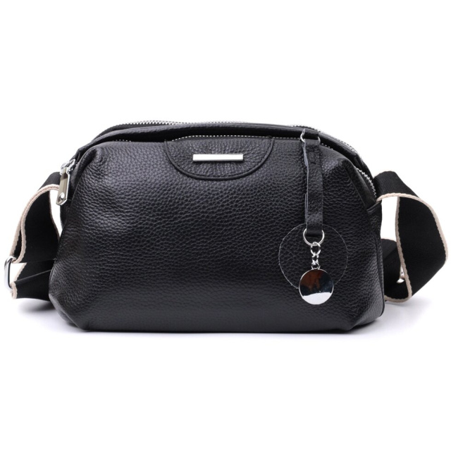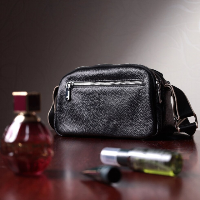 Містка сумка для жінок з натуральної шкіри флотар, яка має зернисту фактуру. У виробі використано шкіру класичного чорного кольору. Аксесуар складається з двох відділень, які закриваються на блискавки, потайної кишені на блискавці та кишені відкритого типу, а також кишені зовні на тильній стороні. Виріб має тверде дно, що дозволяє зберігати форму. Носити сумку можна в руці, під рукою, на плечі і через плече, для цього є текстильний ремінь, що не знімається. В аксесуарі використано якісну фурнітуру кольору срібла. Відмінний варіант для подарунка близьким та дорогим дівчатам та жінкам.