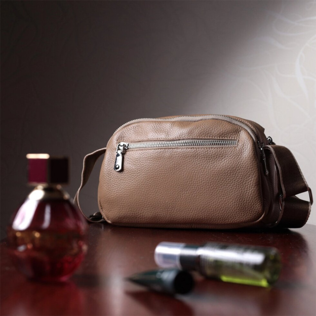 Жіноча сумка з натуральної шкіри флотар, яка має зернисту фактуру. У виробі використано шкіру бежевого кольору. Аксесуар складається з двох відділень, які закриваються на блискавки, потайної кишені на блискавці та кишені відкритого типу, а також кишені зовні на тильній стороні. Виріб має тверде дно, що дозволяє зберігати форму. Носити сумку можна в руці, під рукою, на плечі і через плече, для цього є текстильний ремінь, що не знімається. В аксесуарі використано якісну фурнітуру кольору срібла. Відмінний варіант для подарунка близьким та дорогим дівчатам та жінкам.