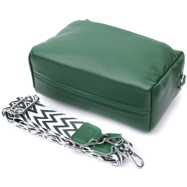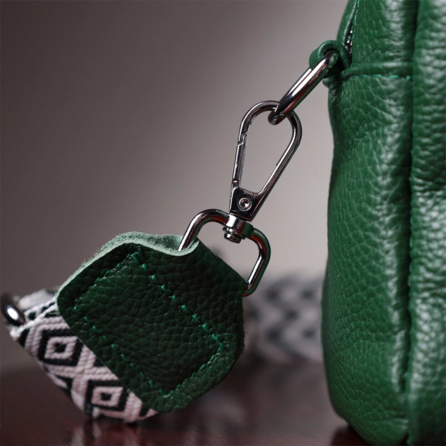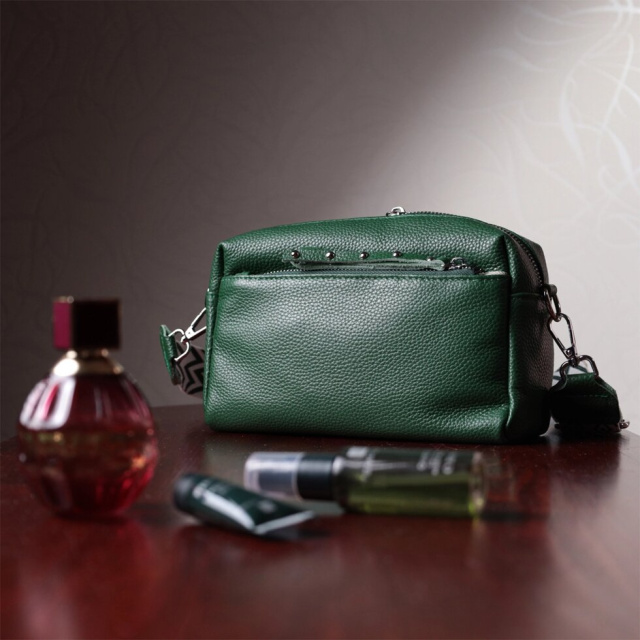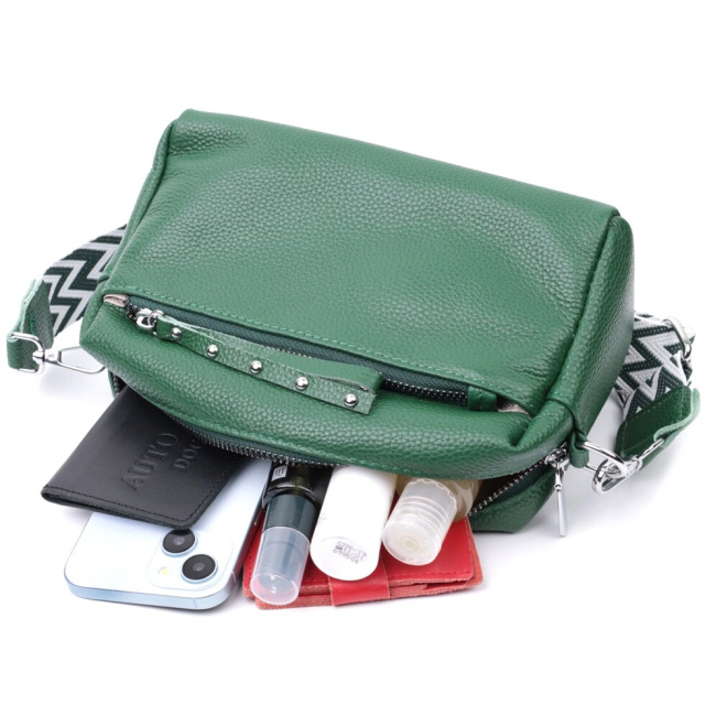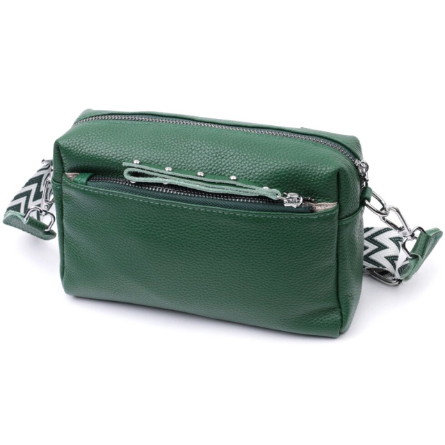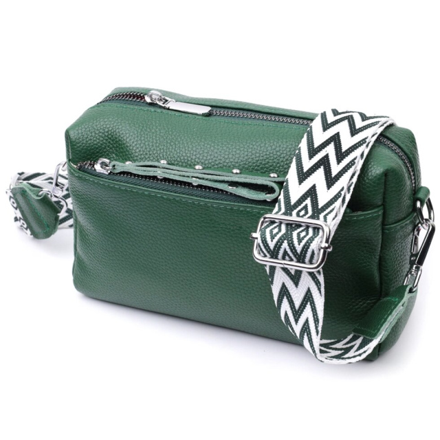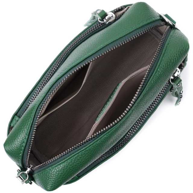Стильна жіноча ідеальна за розміром сумка із натуральної шкіри. Аксесуар складається з основного відділення, що закривається на блискавку, кишені на блискавці та кишені відкритого типу всередині, двох кишень на блискавках зовні, на тильній та лицьовій стороні. Носити сумку можна на плечі і через плече, для цього є текстильний ремінь, що знімається.