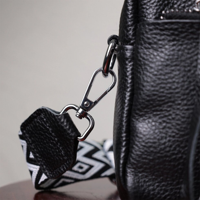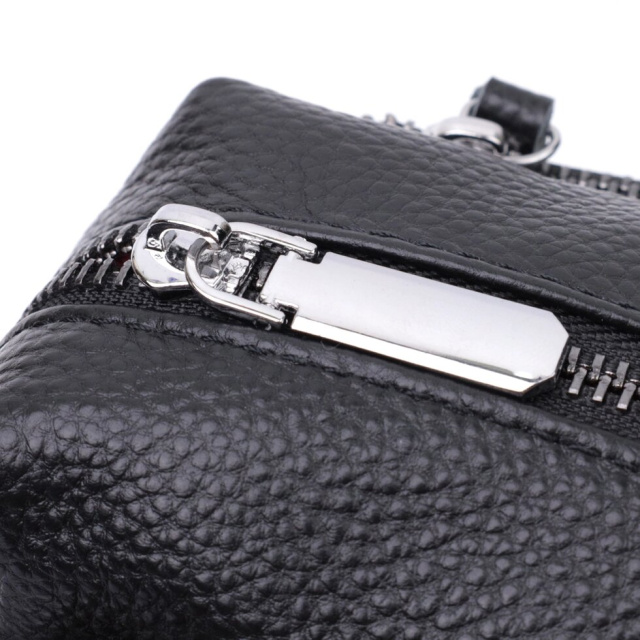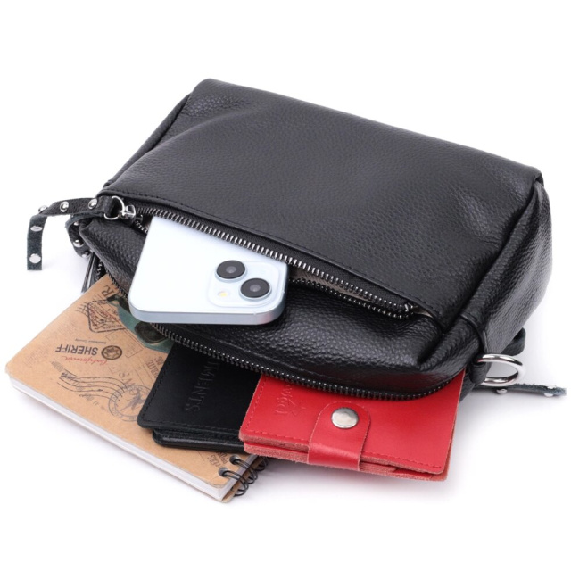 Практична сумка жіноча в класичному чорному кольорі з натуральної шкіри. Аксесуар складається з основного відділення, що закривається на блискавку, кишені на блискавці та кишені відкритого типу всередині, двох кишень на блискавках зовні, на тильній та лицьовій стороні. Носити сумку можна на плечі і через плече, для цього є текстильний ремінь, що знімається.