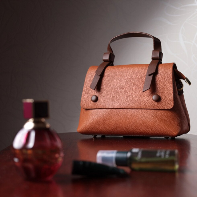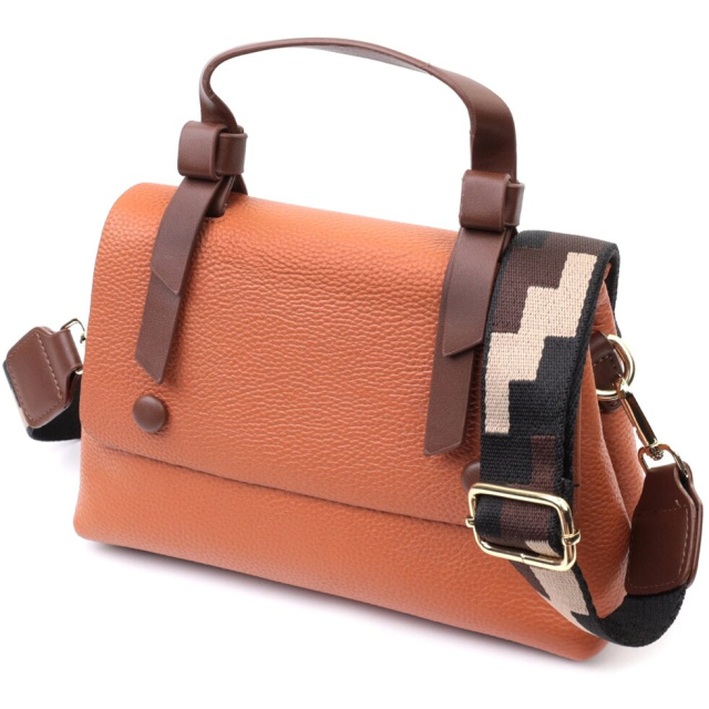 Ділова сумка для жінок у поєднанні двох кольорів рудого та коричневого з натуральної шкіри флотар, яка невибаглива у догляді та довго носиться. У виробі використано металеві ніжки на дні сумки для захисту дна від потертостей та механічних пошкоджень. Аксесуар складається з основного відділення, кишені відкритого типу та потайної кишені на блискавці всередині. Носити сумку можна в руці, на плечі і через плече, для цього є текстильний ремінь і шкіряна ручка. В аксесуарі використано якісну фурнітуру кольору жовтого золота. Універсальний варіант сумки під діловий стиль та на кожен день.