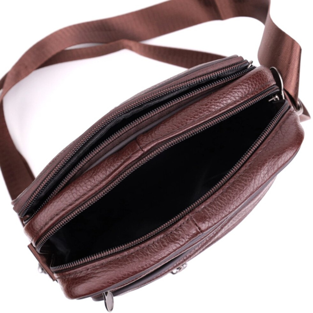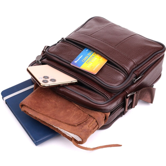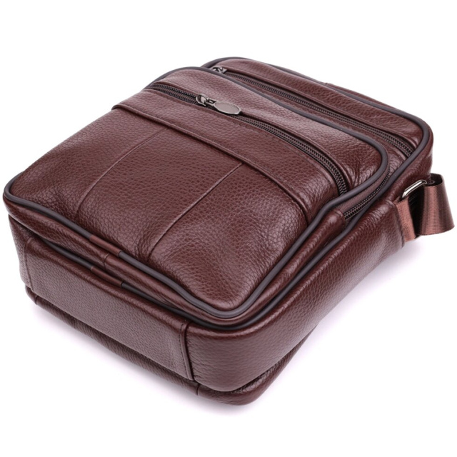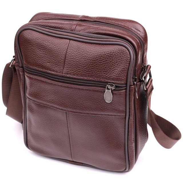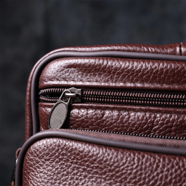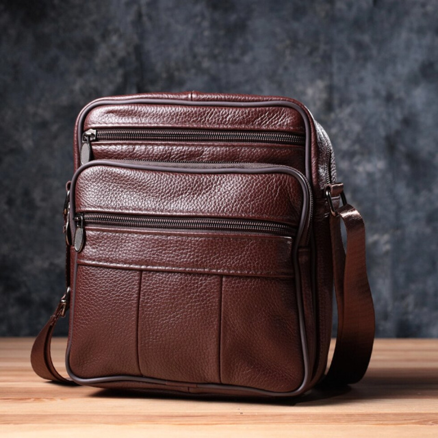 Солідна чоловіча сумка з натуральної шкіри, у коричневому кольорі, з якісною фурнітурою. Аксесуар зовсім не вибагливий у догляді та користується особливою популярністю у чоловіків. Усередині сумки щільна текстильна підкладка. По краях аксесуар прошитий рівним рядком. Сумка стане чудовим подарунком для будь-якого чоловіка.