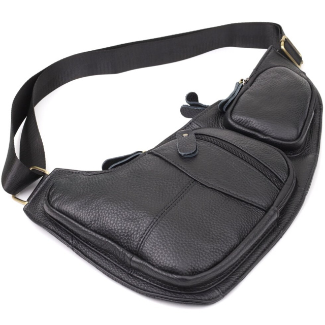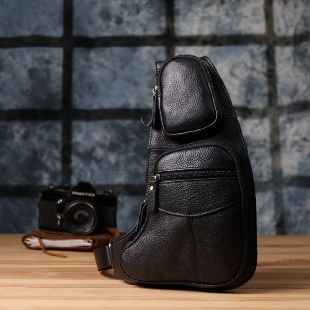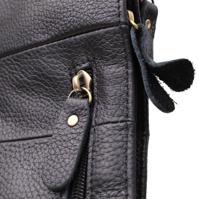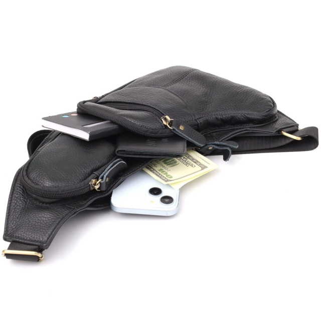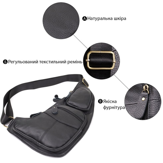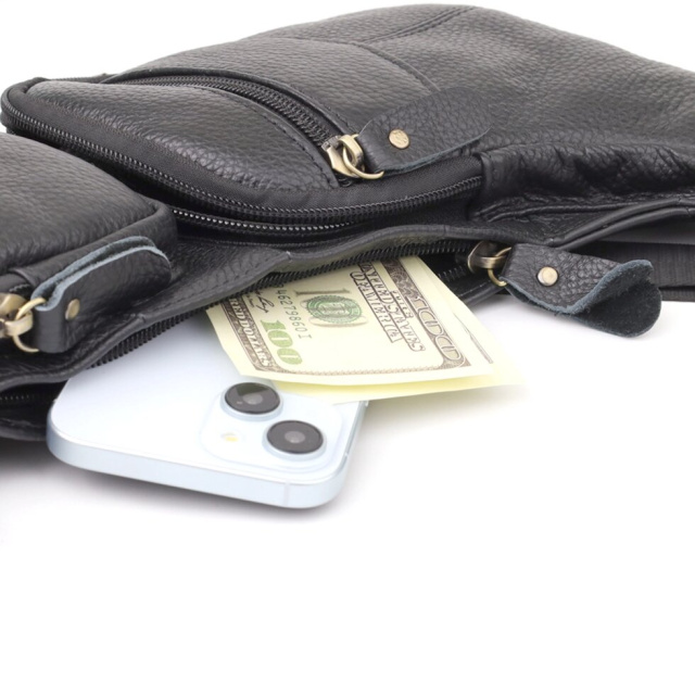 Чорна шкіряна сумка через плече з безліччю кишень — надійний та стильний супутник у будь-яких життєвих ситуаціях, що поєднує у собі практичність та елегантність.