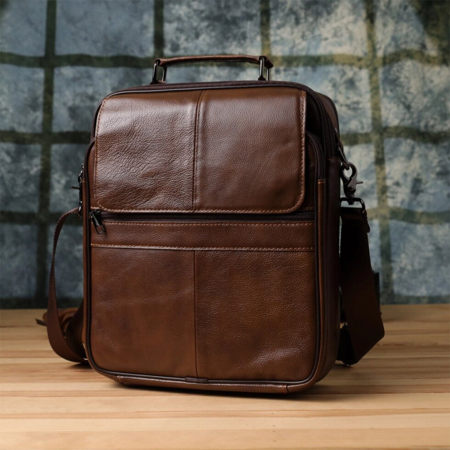 Зручна шкіряна сумка виконана з високоякісної натуральної шкіри та поєднує в собі функціональність та стиль. Модель оснащена двома основними відділеннями на блискавці, одне з яких включає таємну кишеню на блискавці на задній стінці для надійного зберігання важливих дрібниць.