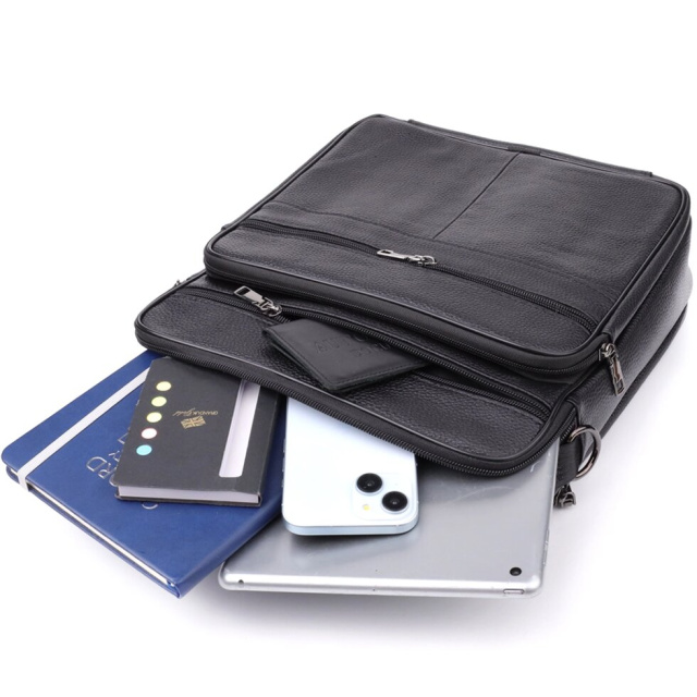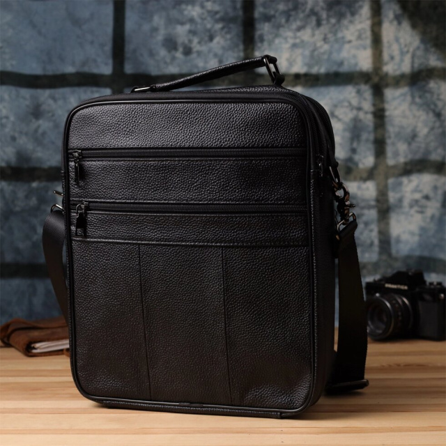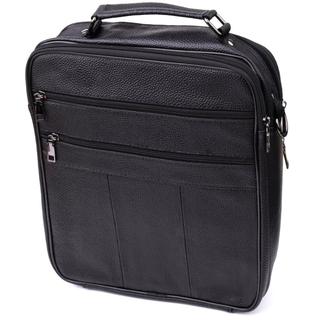 Універсальна чоловіча сумка виконана із міцної натуральної зернистої шкіри флотар, яка відрізняється вираженою текстурою та високою зносостійкістю. Елегантний зовнішній вигляд доповнений фурнітурою срібла, що надає моделі стриманий стиль.