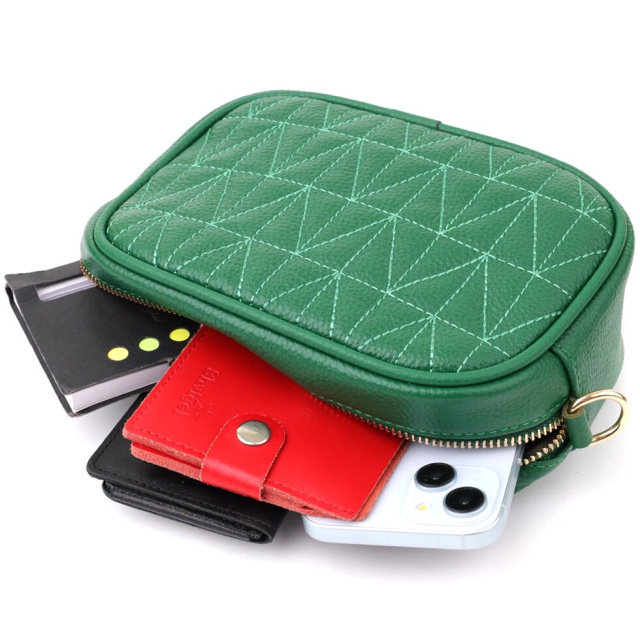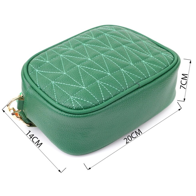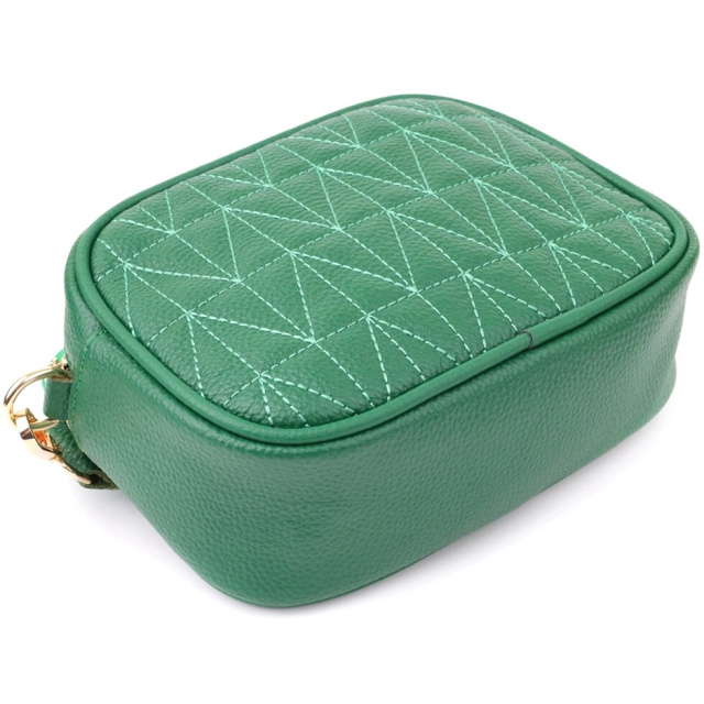 Стильна зелена стьобана сумка Vintage із натуральної шкіри стане стильним доповненням вашого образу, підкреслюючи індивідуальність та витончений смак. Компактна форма надає моделі акуратного та вишуканого вигляду, а стібка на лицьовій стороні робить дизайн більш виразним. Сумка закривається на блискавку, всередині розташоване основне відділення з кишенею на блискавці та відкритою кишенею для дрібниць, а на тильній стороні знаходиться зовнішня кишеня на блискавці для зручного доступу до потрібних речей. Знімний текстильний ремінь, що регулюється, забезпечує комфорт при носінні, а фурнітура під жовте золото гармонійно поєднується з глибоким зеленим відтінком шкіри. Така сумка стане універсальним аксесуаром як для повсякденних виходів, так і для особливих випадків, додаючи образу елегантності та стилю.
