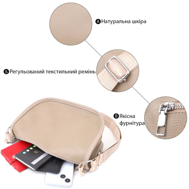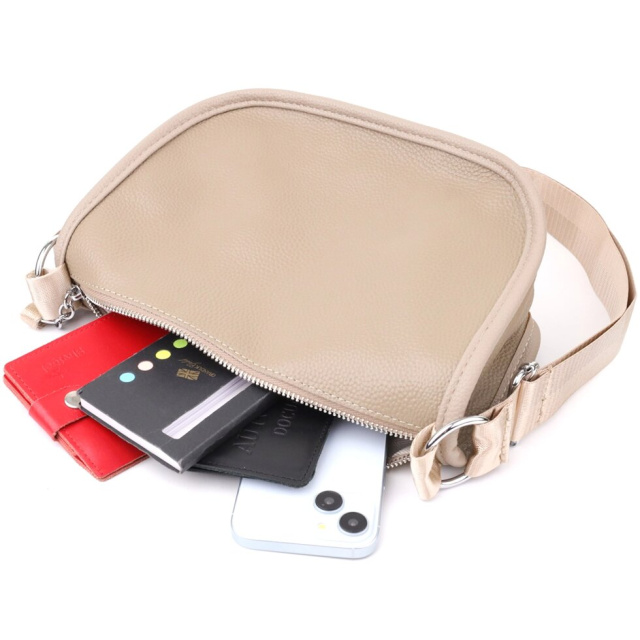 Жіноча шкіряна сумка у бежевому кольорі виконана з якісної зернистої шкіри та має напівкруглу акуратну форму, яка підкреслює витонченість та сучасний стиль. Особливу увагу привертає декоративний бігунок у вигляді елегантного брелка, що надає моделі індивідуальності та шарму. Сумка закривається на блискавку, всередині розташоване основне відділення із двома кишенями на блискавці та двома відкритими кишенями для дрібних предметів, а на тильній стороні є зовнішня кишеня на блискавці. Незнімний текстильний ремінь забезпечує зручність при носінні, а фурнітура під срібло гармонійно відтінює теплий бежевий колір шкіри. Ця сумка стане стильним та практичним аксесуаром як для повсякденних образів, так і для особливих випадків.