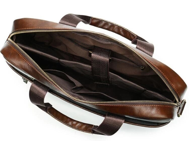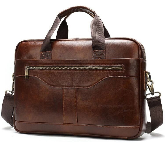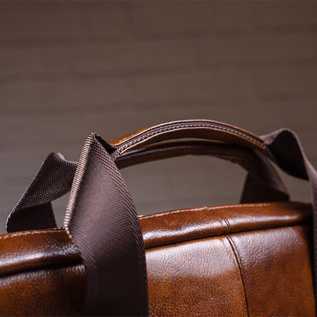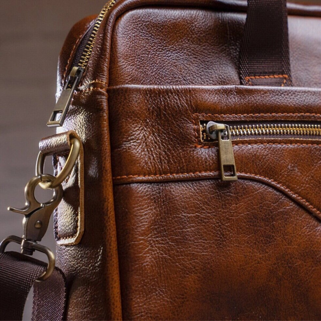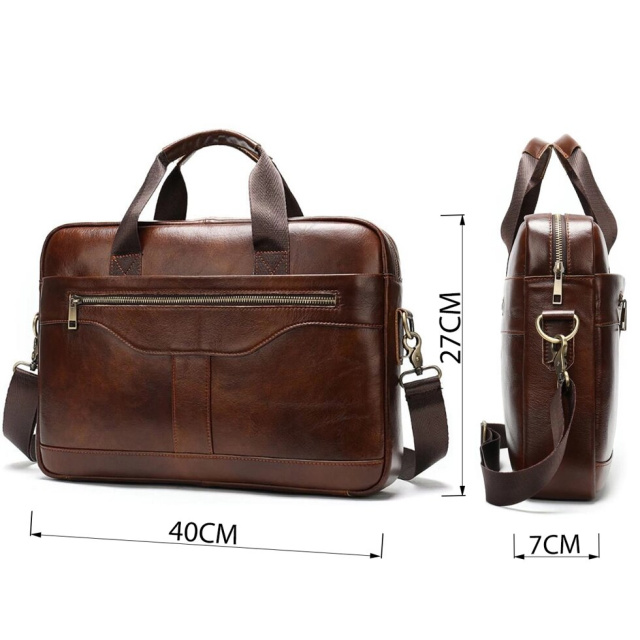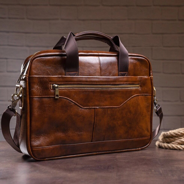 Ділова чоловіча сумка з натуральної шкіри в класичному дизайні. Аксесуар можна носити, як в руках за допомогою ручок, так і на плечі є текстильний ремінець, що знімається. Модель доповнена металевою фурнітурою золотистого кольору. По краях аксесуар прошитий рудою ниткою. Ви повинні розуміти, що трохи переплативши за шкіряну сумку ви виграєте в тому, що вона прослужить вам набагато довше ніж текстильні або з замінника. Аксесуар зручно тримати в руці. Сумка неважка і має величезний функціонал. У ній вам буде зручно носити документи або планшет або книгу. В сумку легко поміститься ноутбук і вона буде вам прекрасним помічником на ділових зустрічах або зборах. З такою сумкою буде зручно їздити у відрядження або дрібні подорожі. Вона підкреслить ваш статус і відчуття стилю. Сумка буде бажаним подарунком для будь-якого чоловіка. Аксесуар упакований в тканинний мішок, що захищає його від пилу і вологи під час того як ви його не використовуєте.