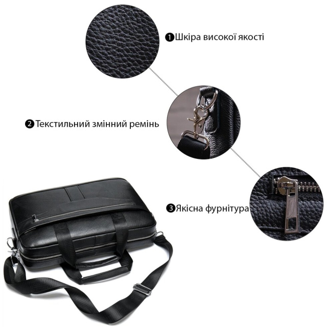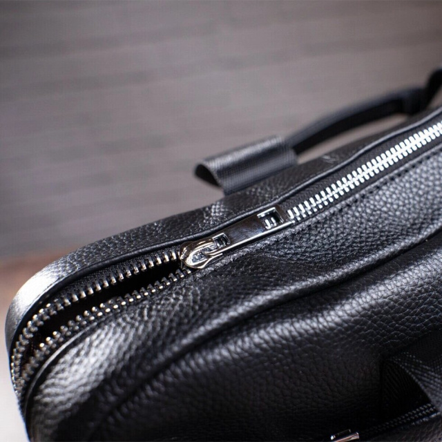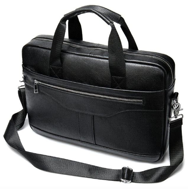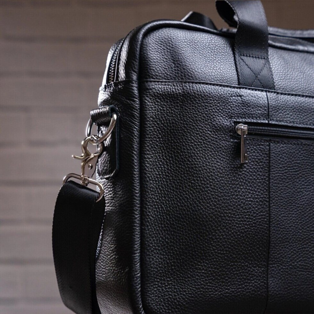 Ділова чоловіча сумка з натуральної шкіри в класичному кольорі. Аксесуар можна носити, як в руках за допомогою ручок, так і на плечі є текстильний ремінець, що знімається. Модель доповнена металевою фурнітурою сріблястого кольору. По краях аксесуар прошитий чорною ниткою. Ви повинні розуміти, що трохи переплативши за шкіряну сумку ви виграєте в тому, що вона прослужить вам набагато довше ніж текстильні або з замінника. Аксесуар зручно тримати в руці. Сумка неважка і має величезний функціонал. У ній вам буде зручно носити документи або планшет чи книгу. В сумку легко поміститься нетбук і вона буде вам прекрасним помічником на ділових зустрічах або зборах. З такою сумкою буде зручно їздити у відрядження або дрібні подорожі. Вона підкреслить ваш статус і відчуття стилю. Сумка буде бажаним подарунком для будь-якого чоловіка. Аксесуар упакований в тканинний мішок, що захищає його від пилу і вологи під час того як ви його не використовуєте.
