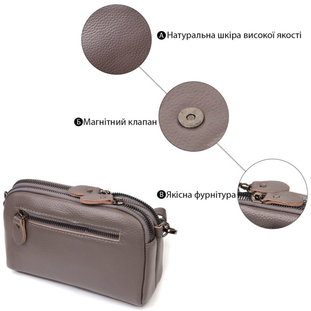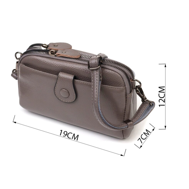 Цікава невелика сумка-клатч із натуральної м'якої шкіри високої якості. Виріб дуже зручний, можна носити на плечі, через плече, під рукою та на кисті. Модель доповнена фурнітурою кольору темного срібла. Аксесуар має два основні відділення на блискавках, в яких дві кишеньки - на блискавці та одна відкритого типу, також зовні знаходяться дві кишені. У комплекті до сумки йде знімний плечовий ремінь та знімний кистьовий ремінь. Модель закривається на блискавку.