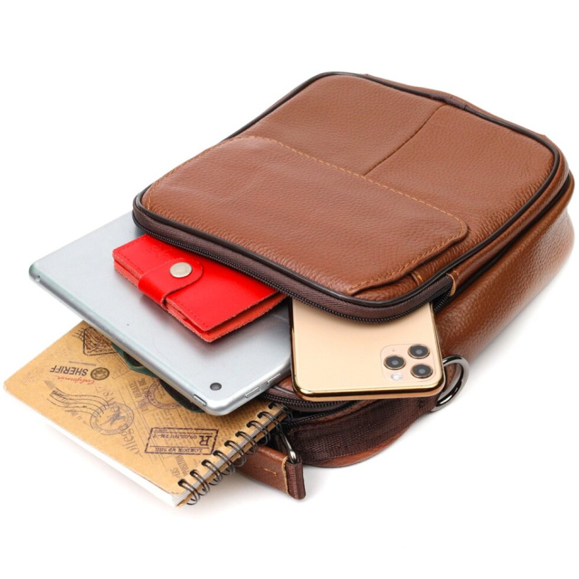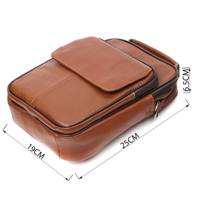 Практична сумка із натуральної шкіри. Аксесуар складається з основного відділення на блискавці, потайної кишені всередині, накладної кишені на блискавці, на лицьовій стороні, вбудованої кишені під клапаном, на магнітах, на лицьовій стороні та двох горизонтальних кишень на блискавках ззаду. Носити сумку можна на плечі, через плече, а також у руках за ручку. Ідеальний варіант як для ділового, так і для міського стилю.
