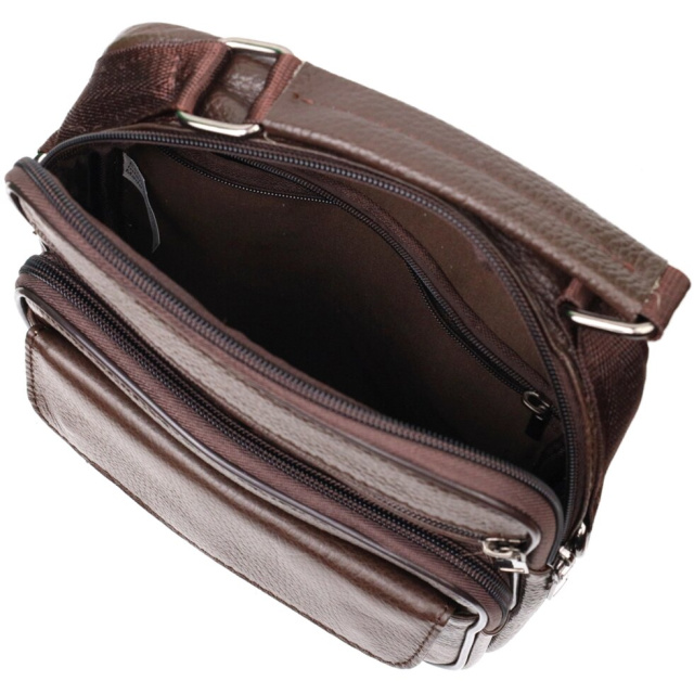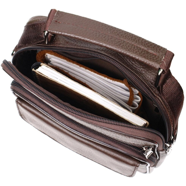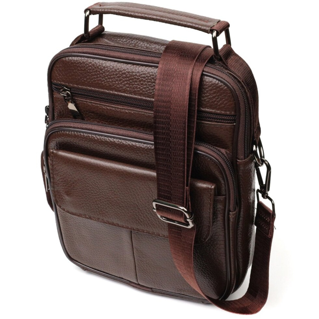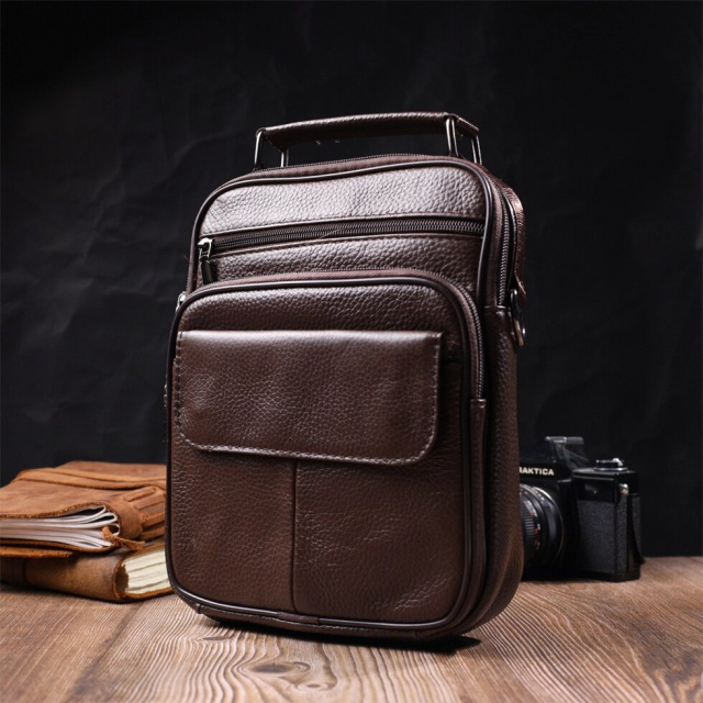 Чоловіча сумка з натуральної шкіри. Аксесуар складається з основного відділення на блискавці, потайної кишені всередині, накладної кишені на блискавці, на лицьовій стороні, вбудованої кишені на блискавці на лицьовій стороні, вбудованої кишені під клапаном на магнітах, на лицьовій стороні та двох горизонтальних кишень на блискавках ззаду. Носити сумку можна на плечі, через плече, а також у руках за ручку. Ідеальний варіант як для ділового, так і для міського стилю.