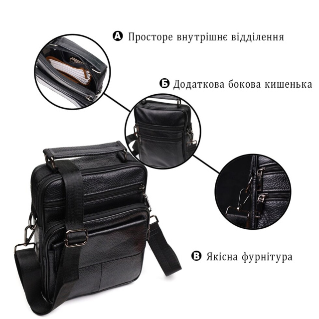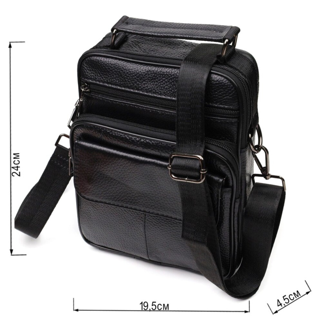Стильна чоловіча сумка з натуральної шкіри. Аксесуар складається з основного відділення на блискавці, потайної кишені всередині, накладної кишені на блискавці, на лицьовій стороні, вбудованої кишені на блискавці на лицьовій стороні, вбудованої кишені під клапаном на магнітах, на лицьовій стороні та двох горизонтальних кишень на блискавках ззаду. Носити сумку можна на плечі, через плече, а також у руках за ручку. Ідеальний варіант як для ділового, так і для міського стилю.