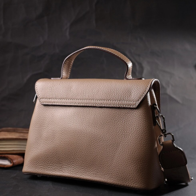 Чарівна сумка з натуральної шкіри флотар, яка невибаглива у догляді та довго носиться. Аксесуар складається з двох основних відділень, потайної кишені на блискавці та кишені відкритого типу. Носити сумку можна в руці, під рукою, на плечі та через плече, для цього є шкіряна ручка та знімний текстильний ремінь у колір виробу. В аксесуарі використано якісну фурнітуру кольору срібла. Універсальний варіант сумки на вечір, щодня, а також відмінно поєднуватиметься з діловим стилем.