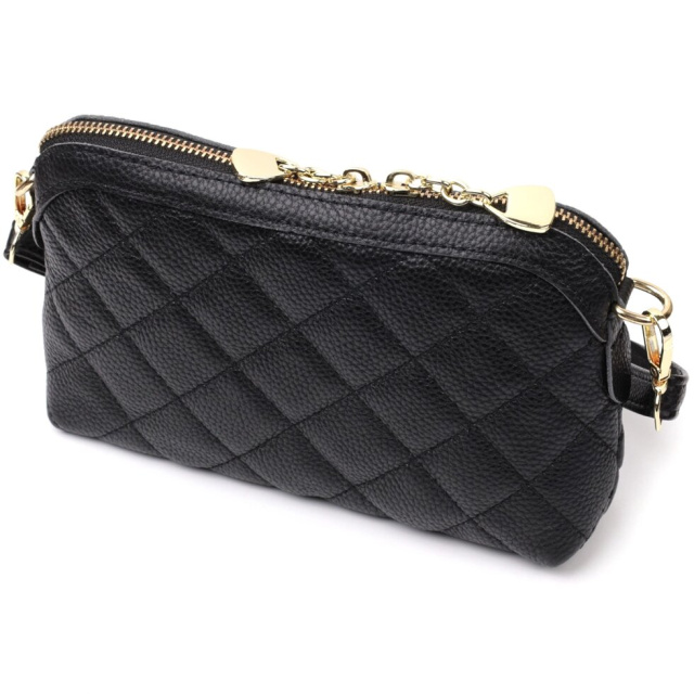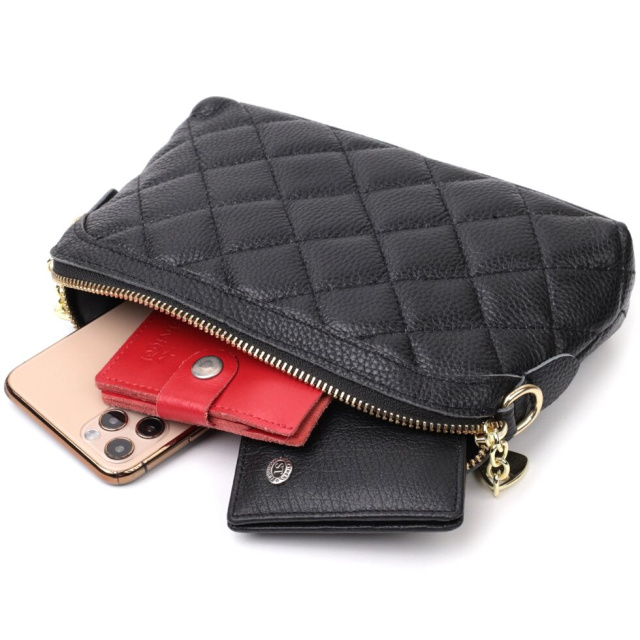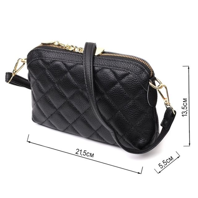 Зручна жіноча стьобана сумка з якісної натуральної шкіри, яка довго носиться і не втрачає свого первісного вигляду. Аксесуар складається з одного основного відділення, всередині якого розташована кишеня відкритого типу та кишеня на блискавці. Носити сумку можна в руці як клатч, на плечі і через плече, для цього є шкіряний ремінь, що знімається. У виробі використано якісну фурнітуру кольору жовтого золота.