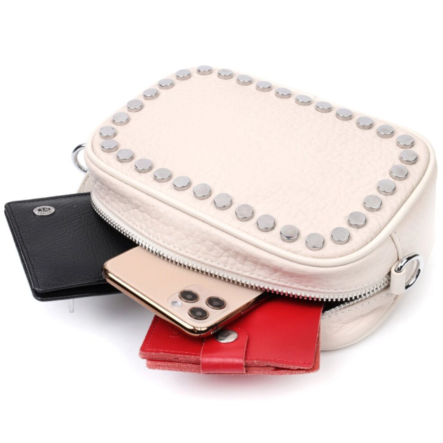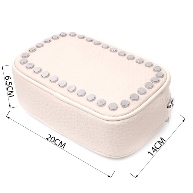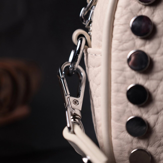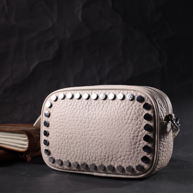 Ідеальна сумка жіноча з натуральної крупнозернистої шкіри, на лицьовій стороні, по краю, декорована кнопками у вигляді прямокутника. Аксесуар складається з одного основного відділення, потайної кишені на блискавці, кишені відкритого типу та кишені на блискавці зовні. Носити сумку можна в руках, на плечі і через плече, для цього є ручка для перенесення в руках і знімний ремінець з ланцюжком для переносу не плечі. У виробі використано надійну фурнітуру срібного кольору. Шкіряна сумка – найкращий подарунок для будь-якої дівчини.