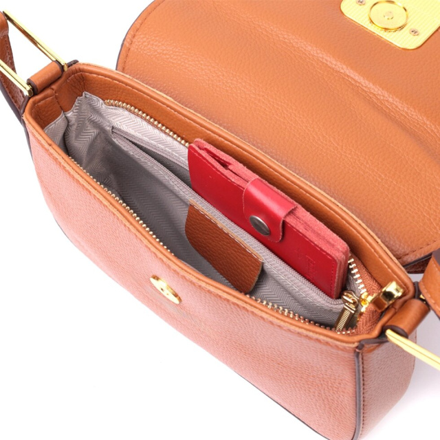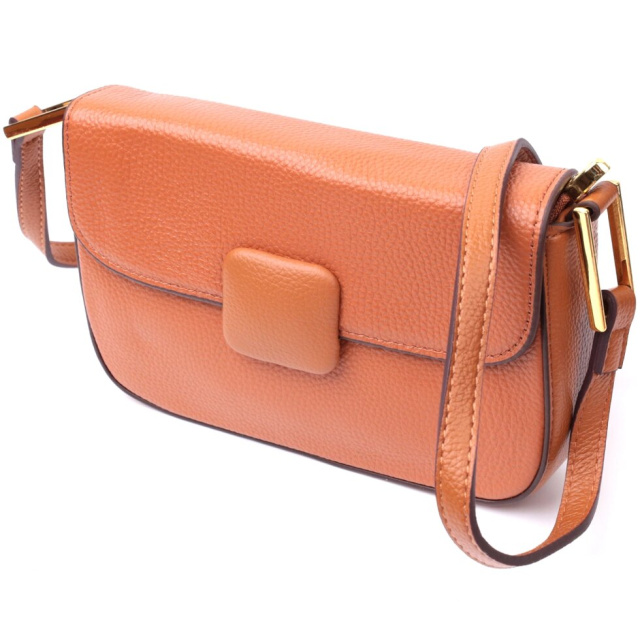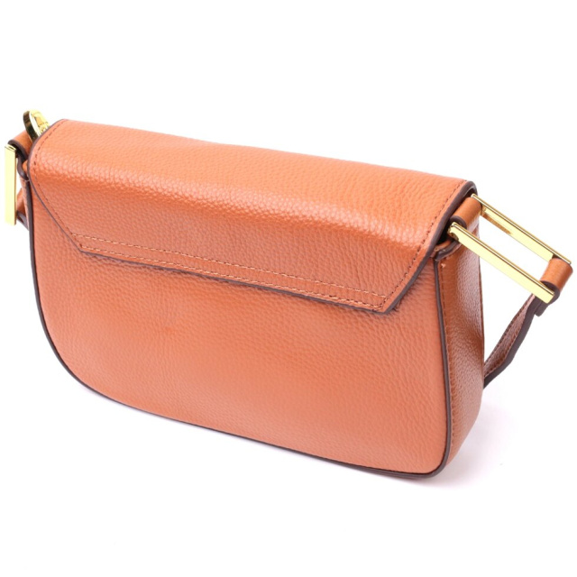 Модна жіноча сумка у стильному теракотовому кольорі з твердим каркасом із натуральної шкіри з високим показником якості та зносостійкості. Аксесуар складається з основного відділення, що закривається на блискавку та клапаном на магніт, усередині якого знаходиться потайна кишеня на блискавці та кишеня відкритого типу. Носити сумку можна на плечі, через плече для цього є незнімний шкіряний ремінь, що регулюється, а також як клатч під рукою. У виробі використано якісну фурнітуру кольору жовтого золота.