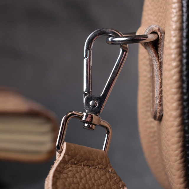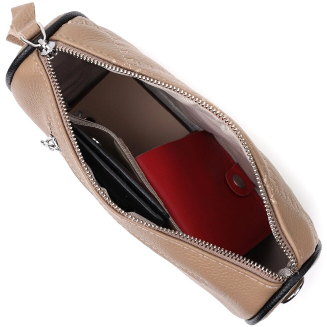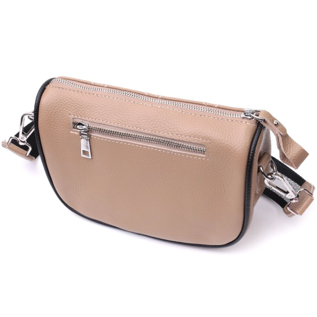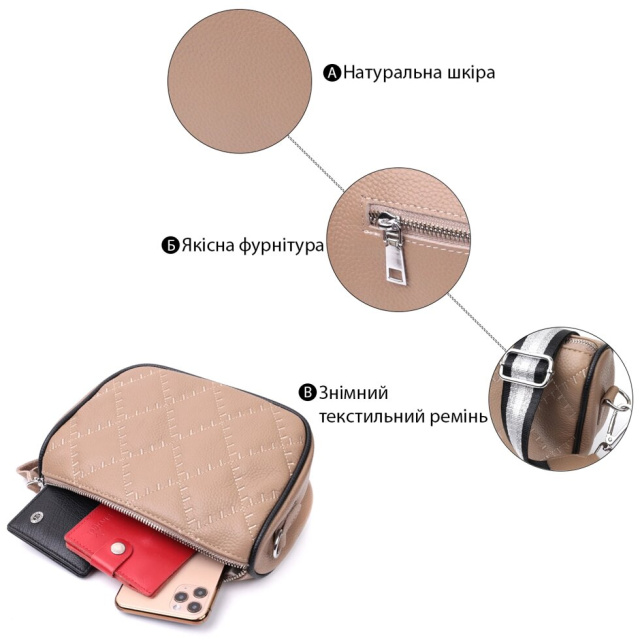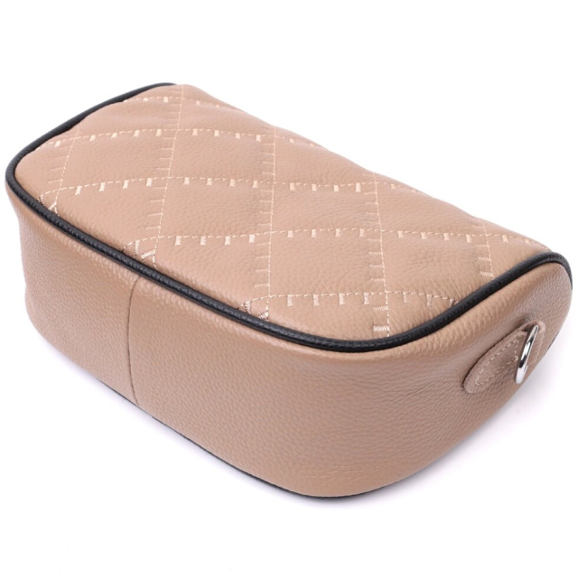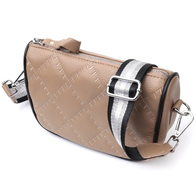 Стильна жіноча напівкругла стьобана сумка з якісної натуральної шкіри, яка довго носиться і не втрачає свого первісного вигляду. Аксесуар складається з одного основного відділення, всередині якого розташована кишеня відкритого типу та кишеня на блискавці, а також кишеня на блискавці зовні, на тильній стороні. Носити сумку можна в руці як клатч, на плечі та через плече, для цього є текстильний ремінь, що знімається. У виробі використано якісну фурнітуру срібного кольору.