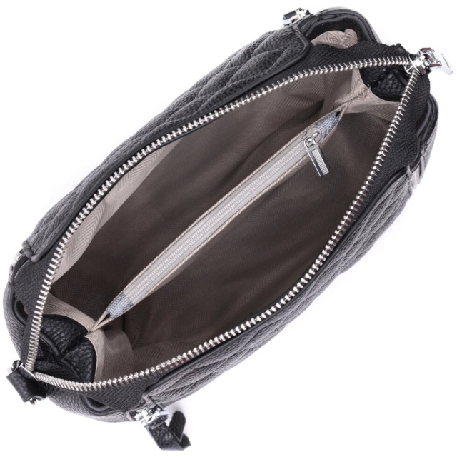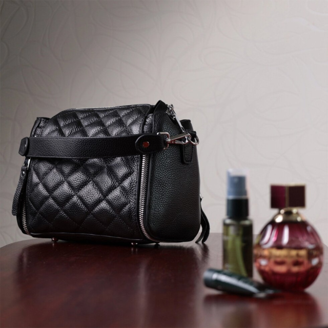 Зручна жіноча сумка з натуральної шкіри флотар, яка невибаглива у догляді та довго носиться. Виріб декорований металевими блискавками з боків, а також прошито ромбами на лицьовій та тильній стороні. У виробі використано металеві ніжки на дні сумки для захисту дна від потертостей та механічних пошкоджень. Аксесуар складається з основного відділення, кишені-перегородки та потайної кишені на блискавці всередині. Носити сумку можна в руці, на плечі та через плече, для цього є шкіряні знімні ремінь та ручка. В аксесуарі використано якісну фурнітуру кольору срібла. Універсальний варіант сумки на вечір, щодня, а також відмінно поєднуватиметься з діловим стилем.