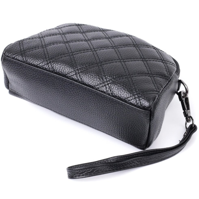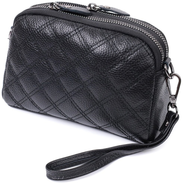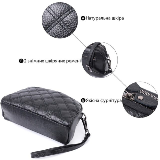 Чудова сумка для жінок із натуральної шкіри високої якості. Виріб дуже зручний, можна носити на плечі, руках і на кисті, для цього є шкіряний ремінець, що знімається і знімний кистьовий ремінь. На лицьовій стороні сумка прошита ромбами, що надає особливого шарму виробу. Модель доповнена фурнітурою кольору темного срібла. Аксесуар має два відділення, що закриваються на блискавки, дві кишеньки - одна на блискавці та одна відкритого типу всередині та одна кишеня на блискавці на тильній стороні. Якщо Вам потрібен варіант повсякденної сумки, яка відмінно підійде як вечірня, то ця модель ідеальний варіант.