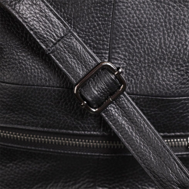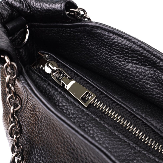 Модель укомплектована одним шкіряним ремінцем, що знімається, довжина якого регулюється, дозволяючи носити сумку на плечі або через плече — так, як зручно саме вам. Фурнітура під срібло підкреслює строгість та лаконічність чорного кольору, додаючи сумці сучасного та вишуканого звучання.