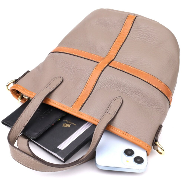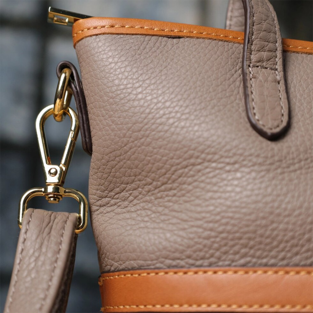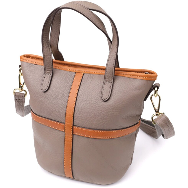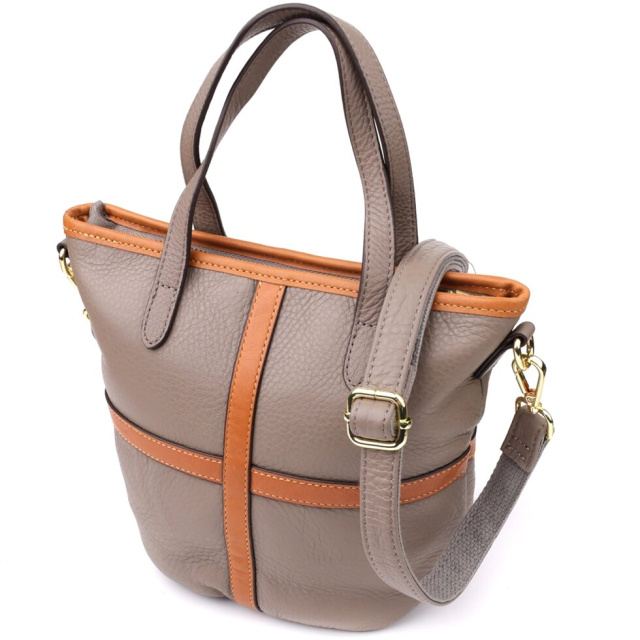 Тверде дно допомагає сумці зберігати форму та надає їй стійкості. Фурнітура кольору жовтого золота ефектно контрастує зі шляхетним сірим відтінком шкіри, додаючи аксесуару витонченості.
