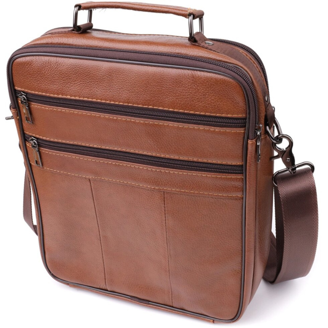 Зручна чоловіча сумка виконана із міцної натуральної зернистої шкіри флотар, що відрізняється вираженою текстурою та високою зносостійкістю. Елегантний зовнішній вигляд доповнений фурнітурою срібла, що надає моделі стриманий стиль.