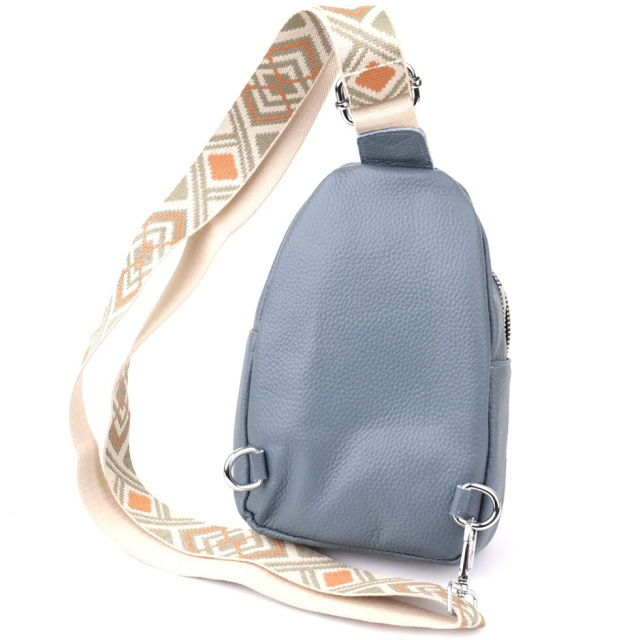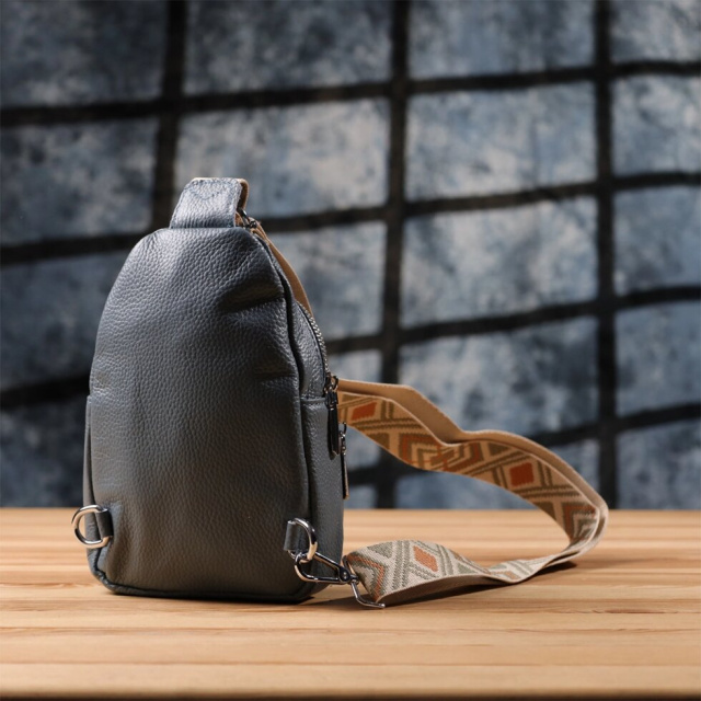 На особливу увагу заслуговує регульований текстильний ремінь з яскравим стильним візерунком - він не тільки забезпечує комфортну посадку на тілі, але і стає виразним елементом дизайну. Ремінь незнімний, але легко регулюється під ваше зростання і спосіб носіння. Фурнітура виконана в сріблястому кольорі, що надає аксесуару сучасний і стриманий блиск, який чудово поєднується з текстурою шкіри та акцентами ременя.