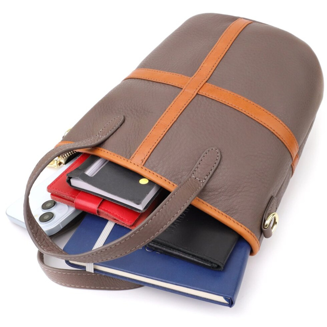 Стильна бежево-сіра шкіряна сумка у формі трапеції - це універсальний аксесуар, що поєднує сучасну елегантність і практичність. Виконана з натуральної шкіри високої якості, вона привертає увагу лаконічним силуетом та вишуканими деталями.