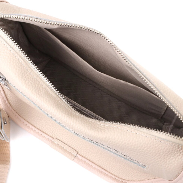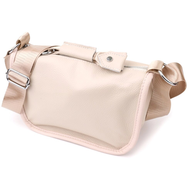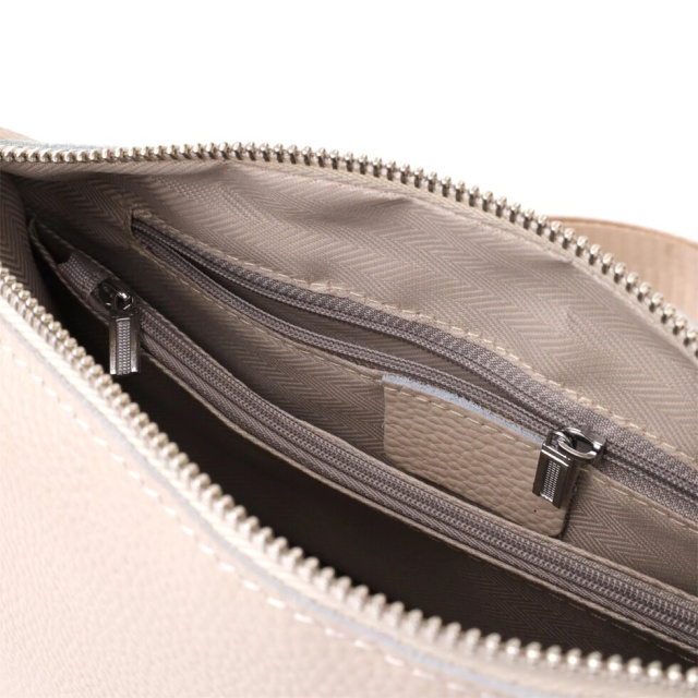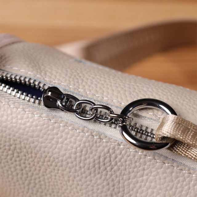Жіноча шкіряна сумка у ніжному білому кольорі виконана з якісної зернистої шкіри та має напівкруглу акуратну форму, що підкреслює елегантність та легкість образу. Декоративний бігунок у вигляді стильного брелка надає моделі індивідуальності та витонченому шарму. Сумка закривається на блискавку, всередині розташоване основне відділення із двома кишенями на блискавці та двома відкритими кишенями для дрібниць, на тильній стороні є зовнішня кишеня на блискавці. Незнімний текстильний ремінь забезпечує зручність при носінні, а фурнітура під срібло гармонійно відтінює світлий білий тон шкіри. Ця сумка стане універсальним аксесуаром як для повсякденних виходів, так і для особливих випадків, поєднуючи практичність, стиль та увагу до деталей.
