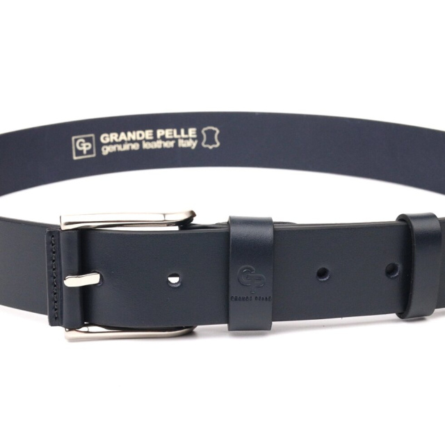 Якісний ремінь під джинси, синього кольору з натуральної шкіри від українського виробника. Хороший ремінь здатний ідеально завершити образ та підкреслити ваш статус. Ремінь виготовлений із цілісного полотна шкіри. Аксесуар має гладку фактуру, акуратно пошитий, довжина регулюється у менший бік. Доповнено ремінець сріблястою пряжкою з гострими кутами. Шкіряний ремінець один із найвдаліших та потрібних подарунків для будь-якого чоловіка.