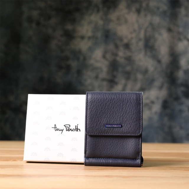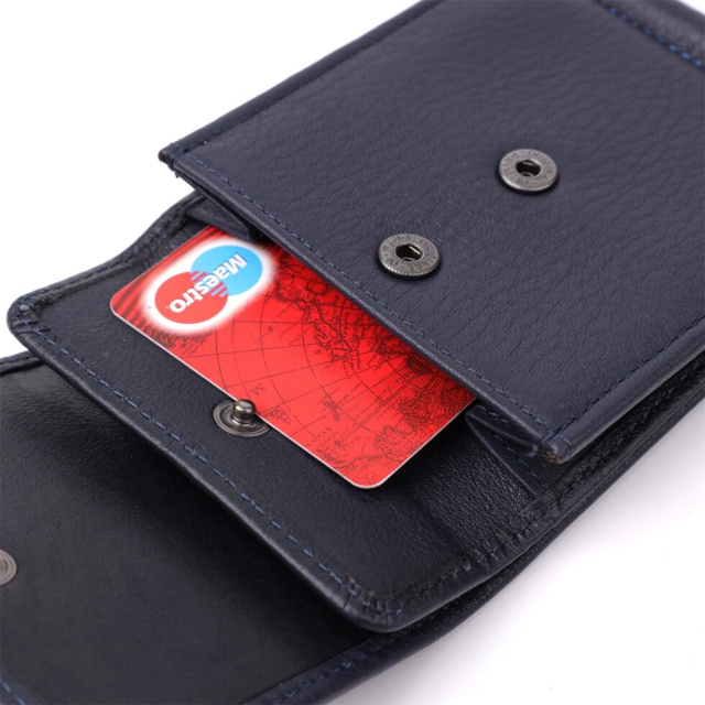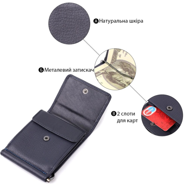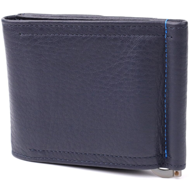 Стильний затискач для грошей із зернистої натуральної шкіри синього кольору - це поєднання мінімалізму та функціональності. Компактна форма, продумані відділення для карт та надійний металевий затискач забезпечують зручне зберігання. Контрастна прошивка та металевий логотип бренду надають аксесуару сучасного та елегантного вигляду, підкреслюючи смак та статус власника.
