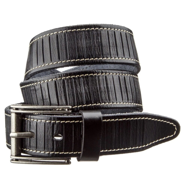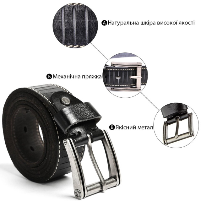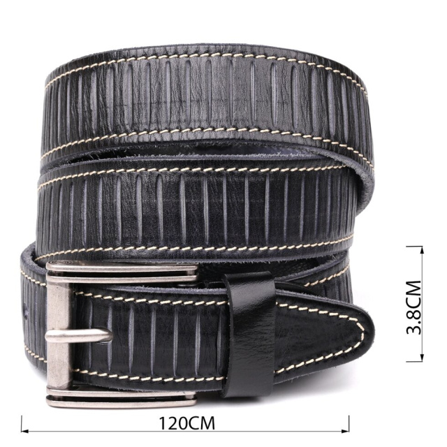Стильний ремінь зі шкіри. Модель доповнена рівним світлим рядком по краях і оригінальним тисненням. Доповнено аксесуар солідною пряжкою з надійного металевого сплаву. Ремінь регулюється по довжині в меншу сторону, зробити це дуже просто, потрібно всього лише відкрутити гвинтик біля пряжки, відрізати зайву частину і прикрутити назад.