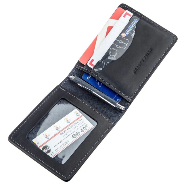 Шкіряний затискач класичного чорного кольору легко замінить вам гаманець або клатч. Якщо ви шанувальник мінімальних аксесуарів такий затискач стане для вас ідеальним аксесуаром. На лицьовій стороні аксесуара є тиснений логотип бренду. По краях моделі прошита рівна строчка в дизайн виробу. Усередині вироба є слот, під прозорою плівкою, для прав або фотографії. Доповнена модель надійним затискачем з міцного металу. Аксесуар буде корисним подарунком для близької людини.