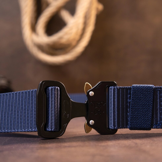 Текстильний ремінець в синьому кольорі з оригінальною пряжкою. Виріб має прекрасний зовнішній вигляд і продуманий дизайн. Текстильний ремінець підійде під штани і джинси. Ремінь - базова частина будь-якого чоловічого образу. З текстильним ремінцем ви заощадите ваші кошти при цьому служить дана модель дуже добре. Виріб стане хорошим подарунком для ваших близьких.