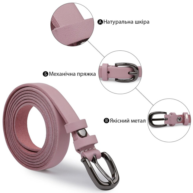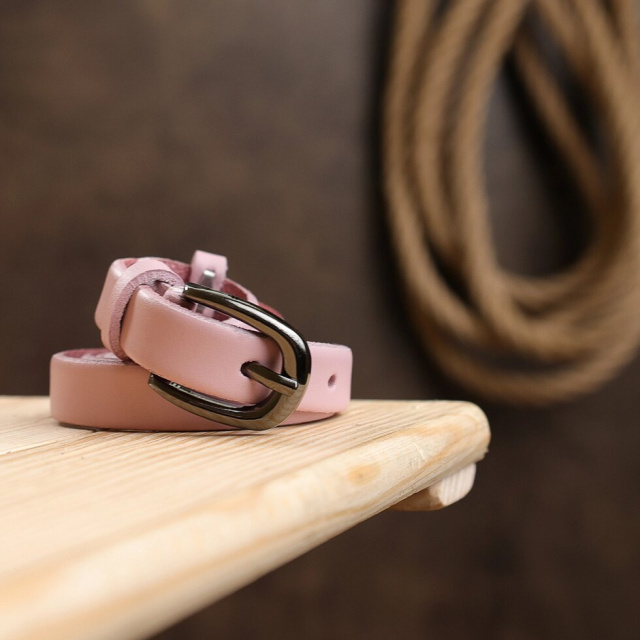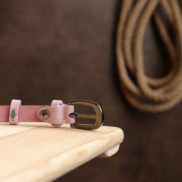 Тонкий жіночий ремінь з класичною пряжкою від українського виробника. Має гарний ніжно-рожевий колір і приємну гладку фактуру. Виконана дана модель з високоміцної натуральної шкіри високого класу. Ремінь стане стильним акцентом у Вашому образі.