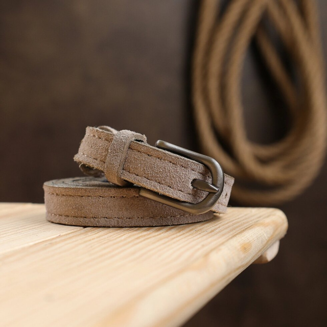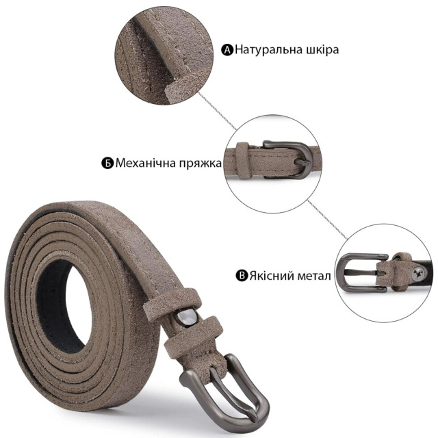Цікавий жіночий тонкий ремінь від українського виробника. Має гарний світло-сірий колір, приємну на дотик фактуру і класичну пряжку. Матеріал виготовлення - натуральна високоякісна шкіра з відмінними показниками зносостійкості. Такий ремінець доповнить Ваш образ і стане улюбленим аксесуаром у Вашому гардеробі.